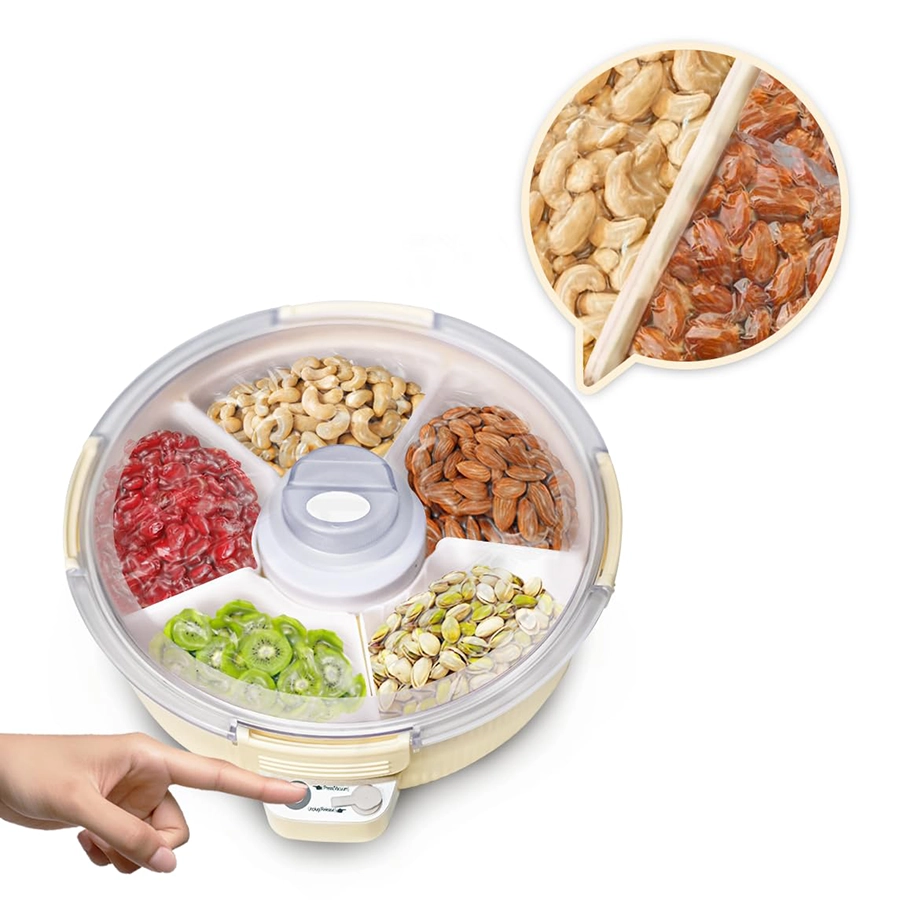 Keep snacks fresh and organized with the MOJOCO Electric Vacuum Serving Tray, featuring divided compartments, a secure lid, and battery-operated convenience for home or travel.
