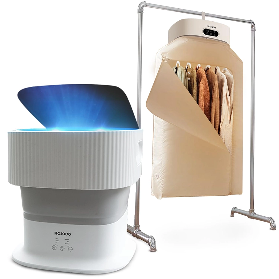 Stay fresh on the go with the Mojoco Portable Clothes Dryer and Foldable Washing Machine, designed for apartments, RVs, and travel with compact, space-saving convenience.